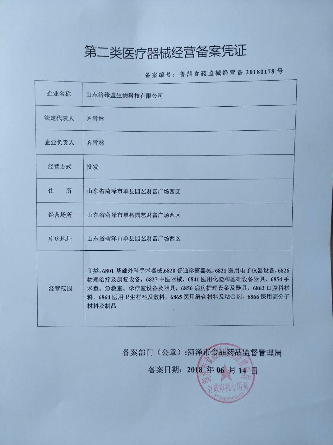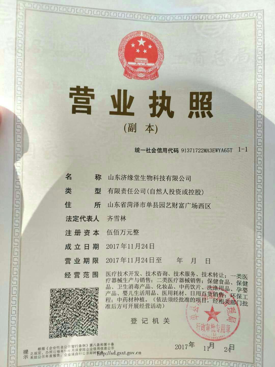 山东济缘堂生物科技有限公司成立于2017年,注册资金500万元,地址位于中国著名的牡丹之乡、武术之乡、书画之乡菏泽单县,公司主营产品:保健食品、化妆品、一二类医疗器械生产与销售,消毒卫生产品、婴儿用品、中药饮片、洗涤用品、孕婴产品等销售 。