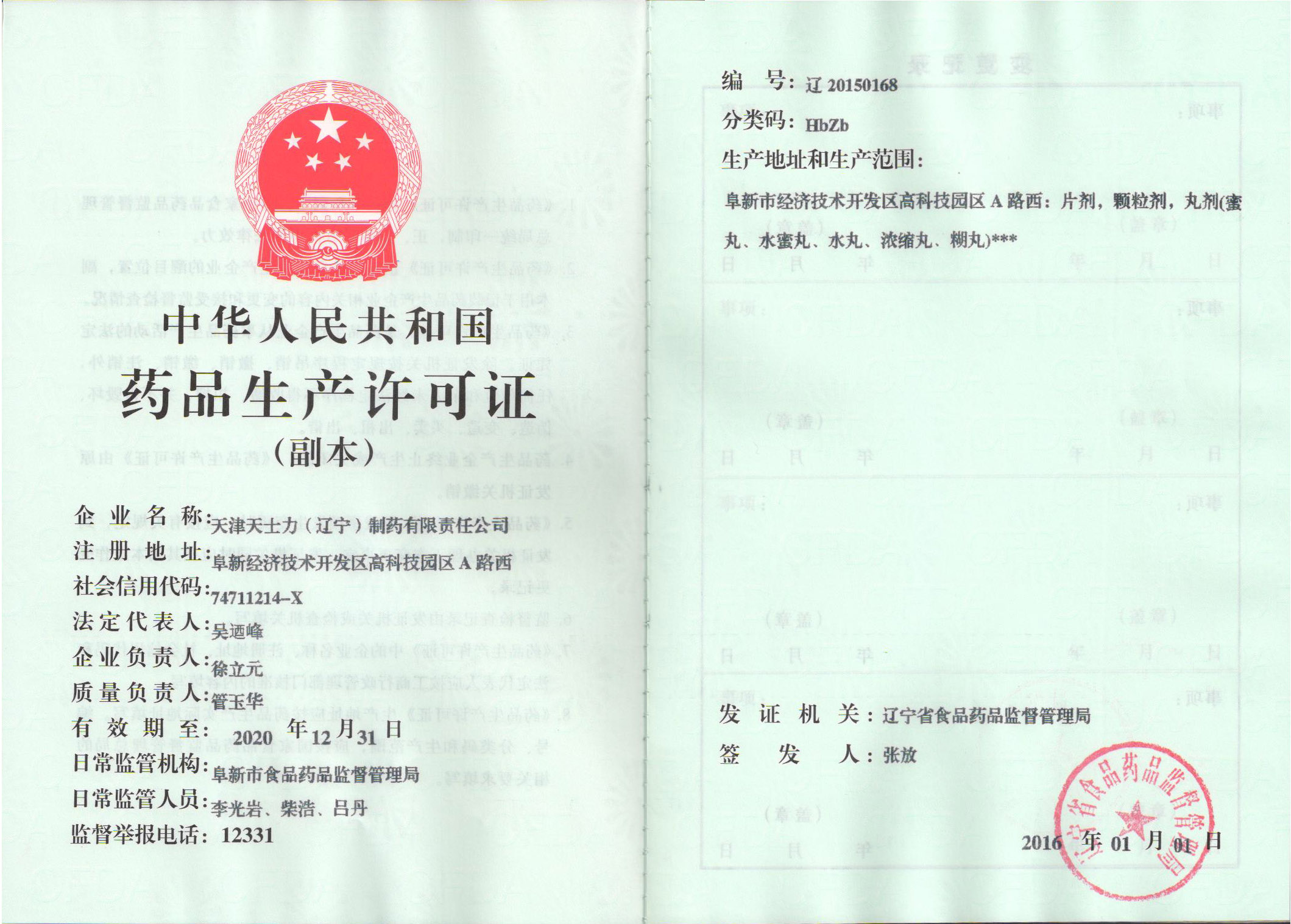 天津天士力(辽宁)制药有限责任公司