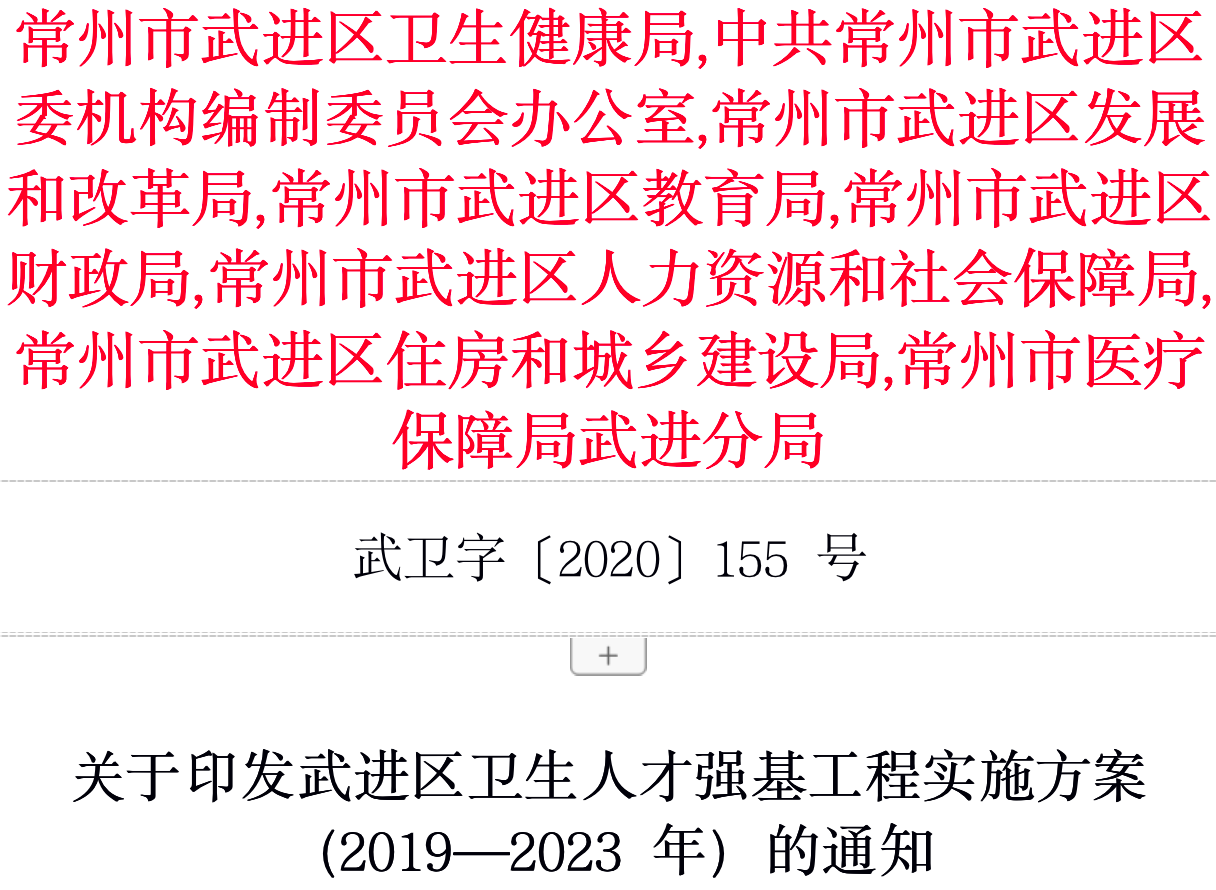 近日,江苏省常州市武进区卫健局、编制委员会办公室等八部门联合发布《关于印发武进区卫生人才强基工程实施方案(2019—2023年)的通知》(以下简称《通知》)。